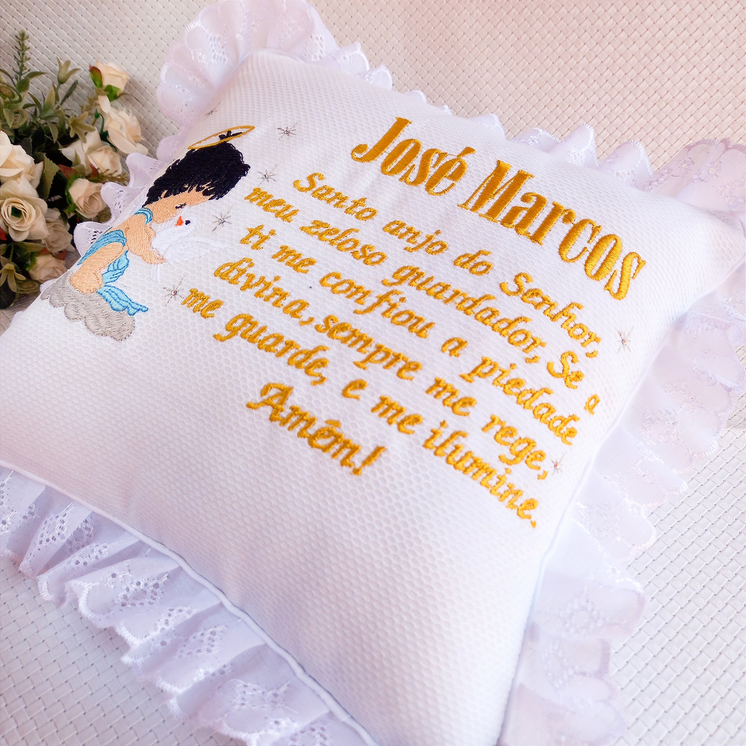 Almofada batizado é confeccionado com material de qualidade 100% algodão com fibra antialérgica.